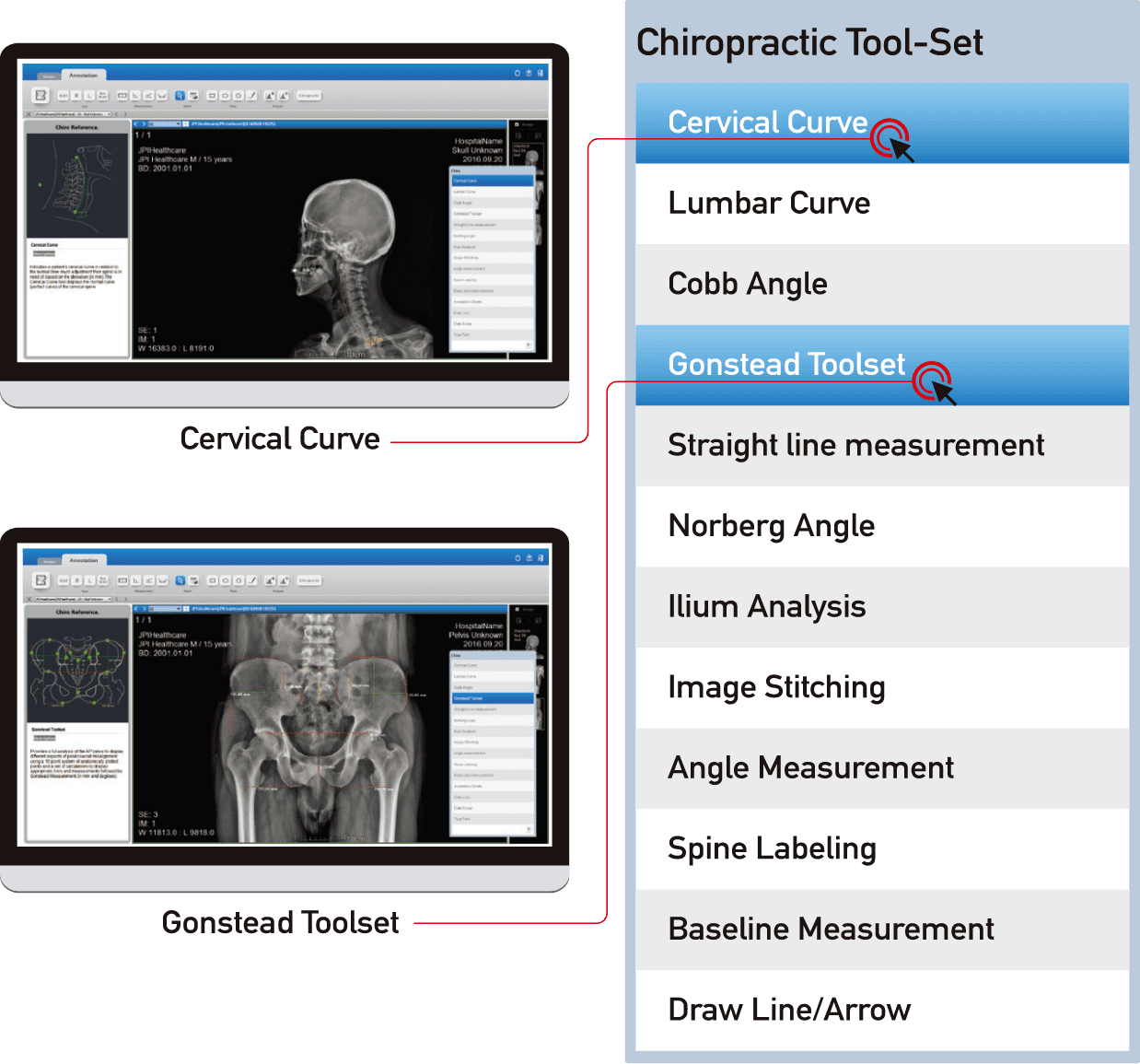 Text, User TEXT, R/L Mark, Length, Angle, Cobb Angle, Chiropractic Tool, Rectangle, Ellipse, Polygon, Freehand, Line profile, Histogram